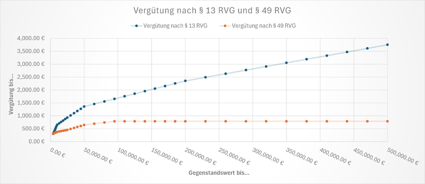 Im Falle der Prozesskostenhilfe richtet sich die Vergütung des beigeordneten Anwaltes nicht nach den allgemeinen Sätzen des § 13 I RVG. Für die vom Staat übernommenen Gebühren legt § 49 RVG ab 4.000,00€ Streitwert eine sich zunehmend vergrößernde Differenz zwischen Prozesskostenmandaten und regulären Mandaten nach RVG fest.